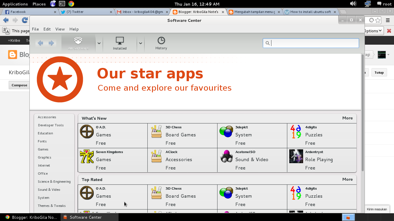 Paket debian sering kali perlu dibuat ulang dari source agar dapat dipakai di ubuntu begitu juga sebaliknya. Semoga tutorial ini dapat membantu temen temen pemula pencinta linux ubuntu dan open source. Cara install software melalui software center.